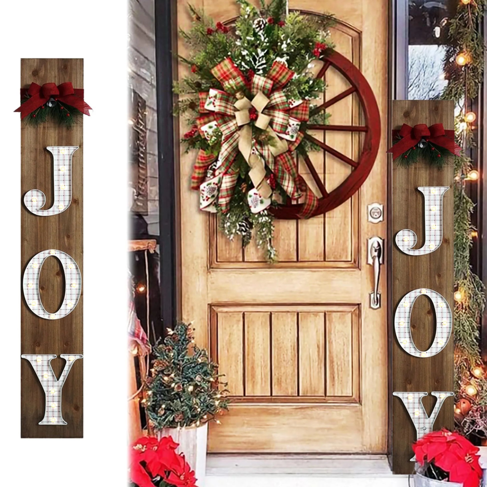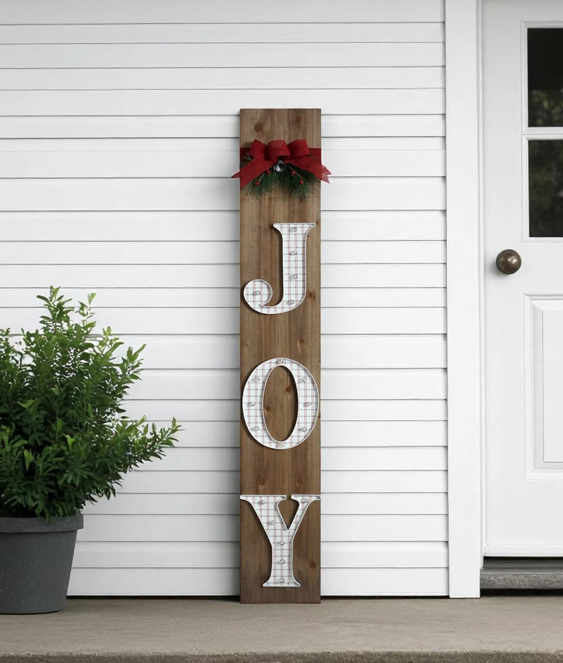 The 60-inch brown solid wood joy Christmas led lights porch sign adds a delightful touch to your outdoor decor. Crafted from solid wood, this traditional-style porch sign serves as a welcoming beacon during the festive season. It is illuminated with led lights, creating a warm and inviting atmosphere for holiday gatherings. Battery-powered for convenience, it allows for easy placement without the need for electrical outlets. Elevate your outdoor space this Christmas with this stunning and festive porch sign. 60-inch h x 1.5-inch w x 9.5-inch d.