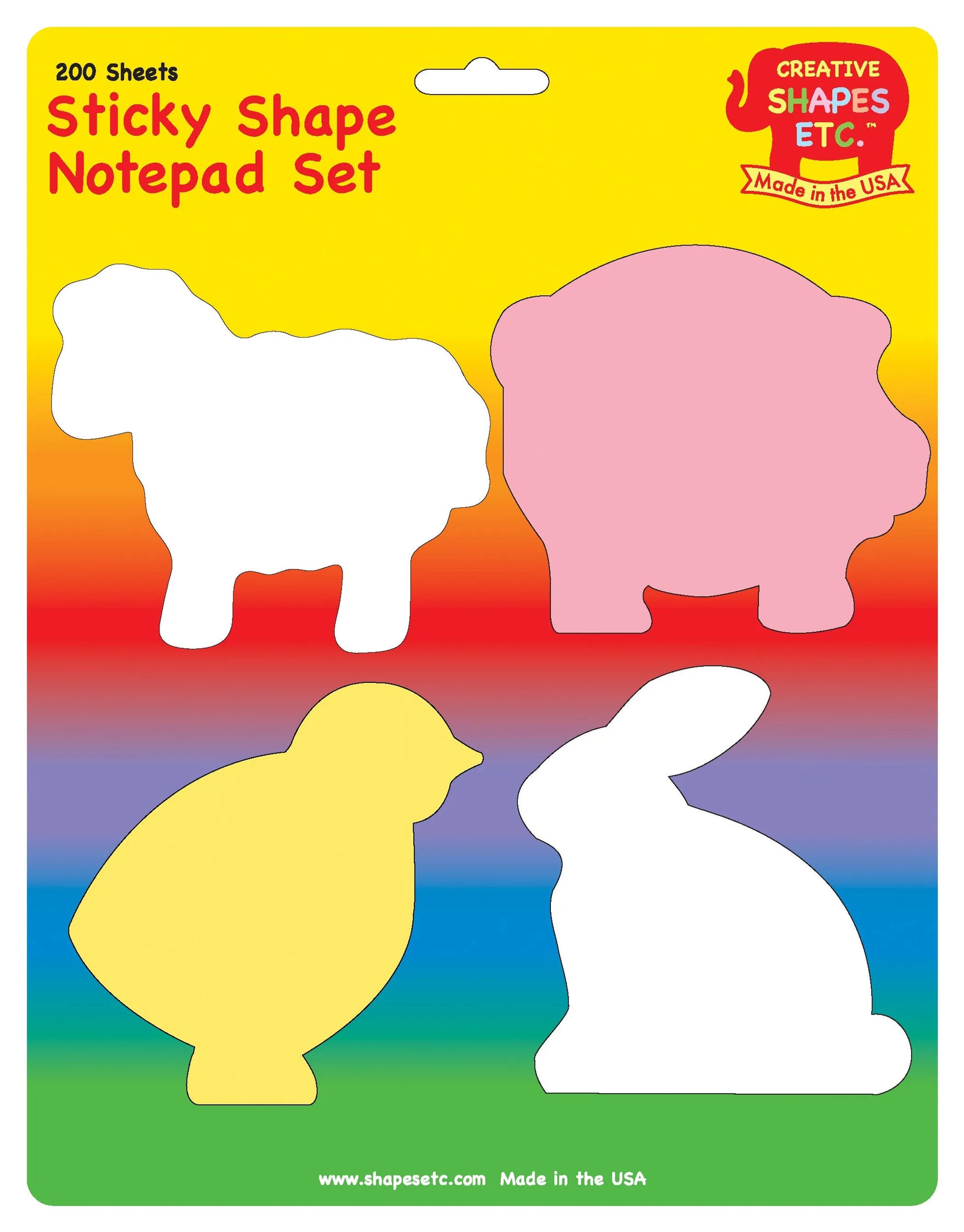 Add a unique and creative touch to any message with this Spring Animal Sticky Set. Set includes four fun, theme Sticky Shape Notepads for a total of 200 sticky sheets. Designs include: Butterfly, Bird, Frog and Squirrel. Each notepad is created from a 3" x 3" paper with approximately a half inch strip of adhesive per notepad. Great for self-reminders, messages, magazine and book markers, tags, planning and journaling, and much more!