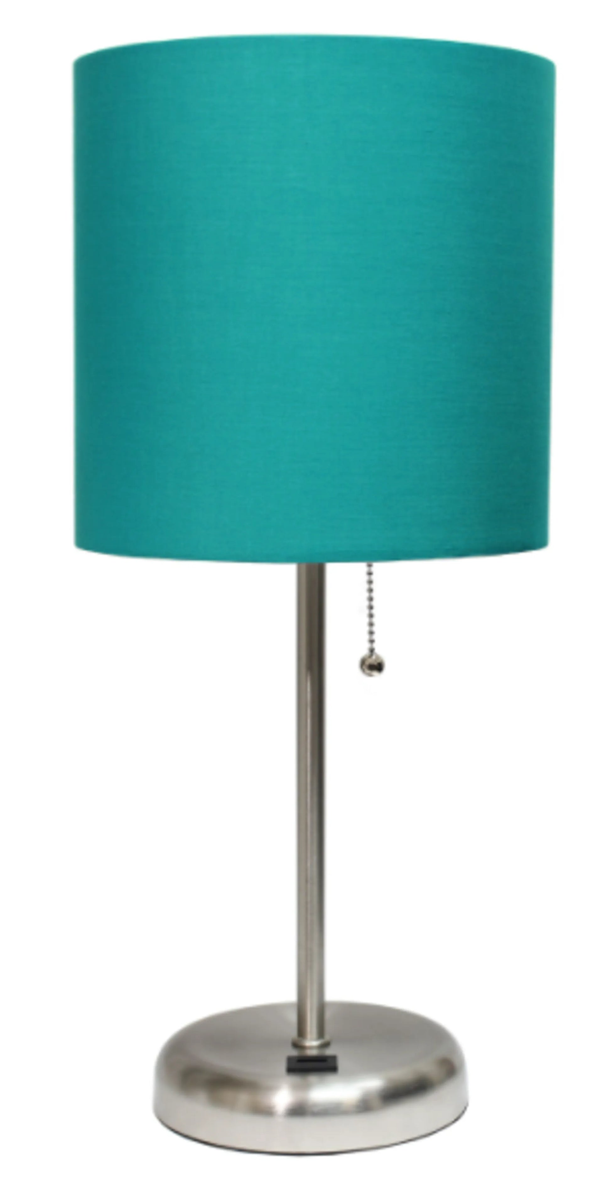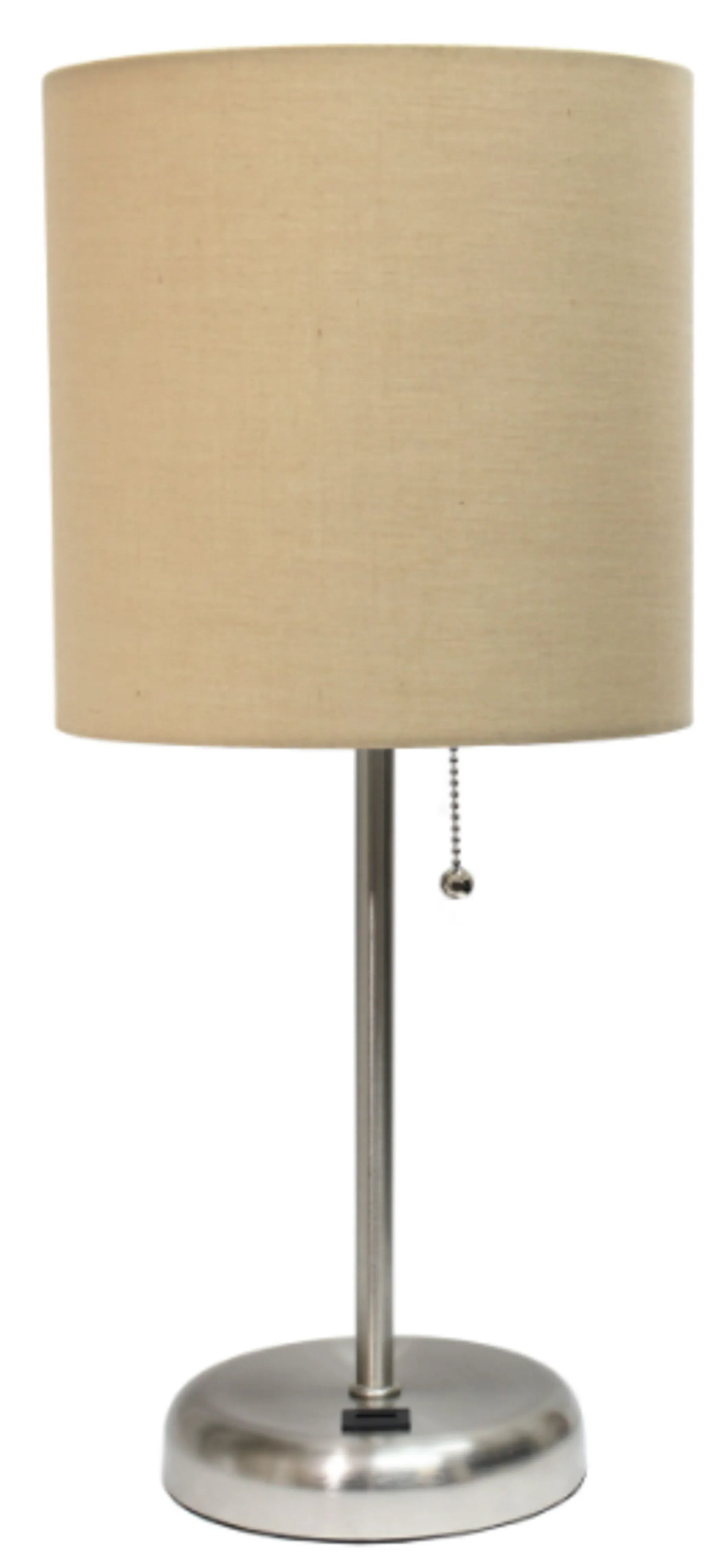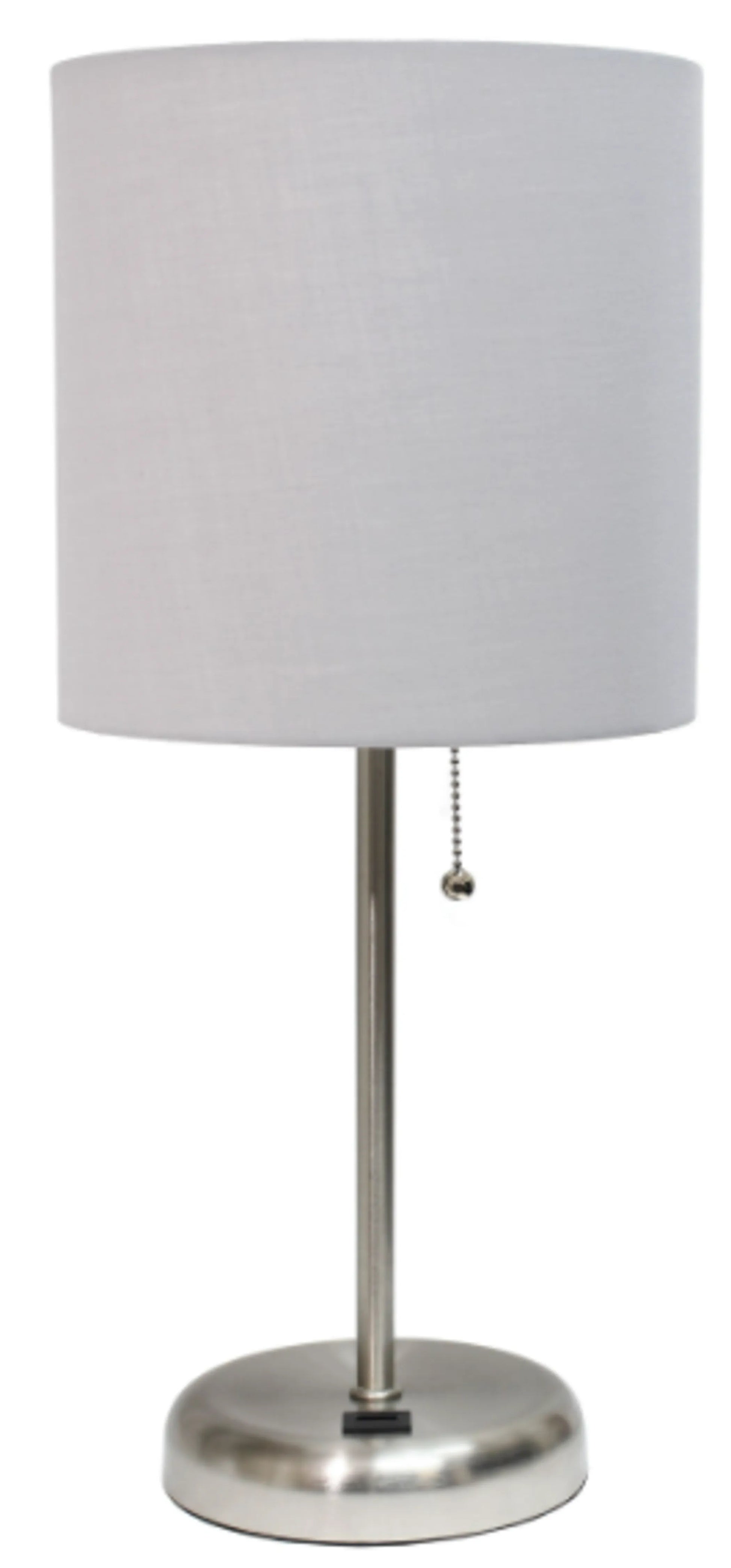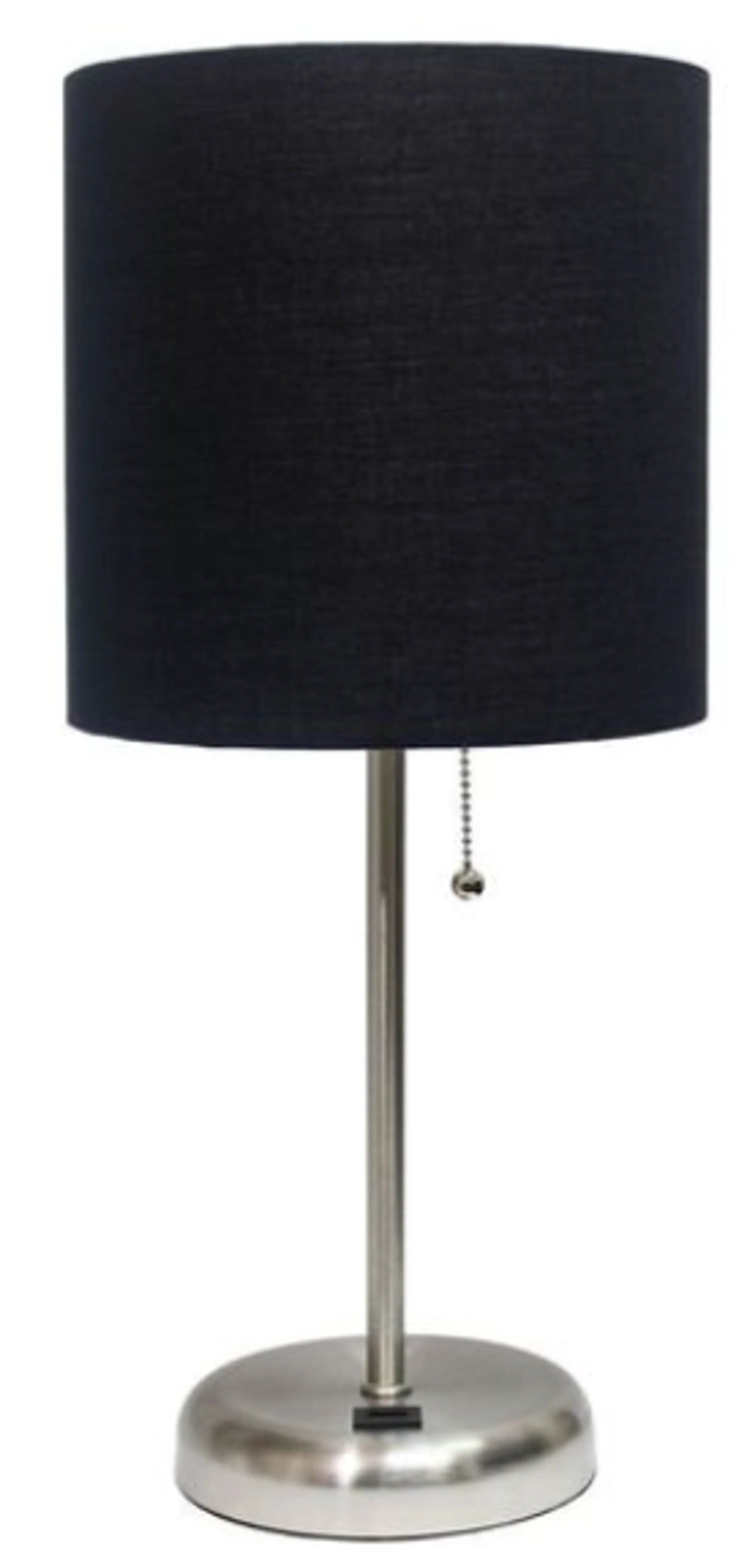 This fun and fashionable lamp features a brushed steel base and a fabric shade. It comes equipped with a USB seated in the base for use to charge mobile phones, handheld games, tablets, and other small electronics. This lamp will add a fabulous flair to any room. Perfect for bedrooms, kids and teens, college dorms, nurseries, or fun offices!