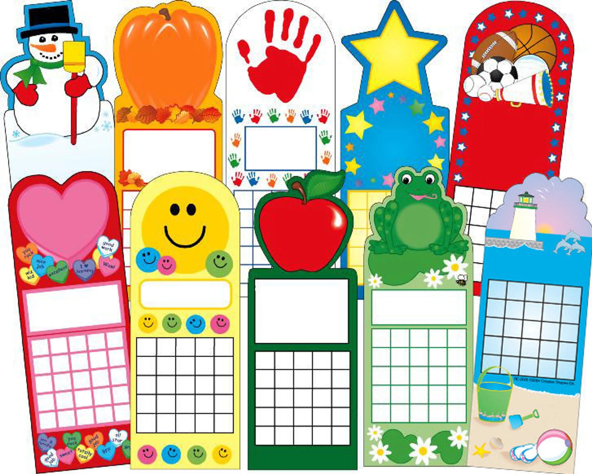 Assortment of 10 seasonal styles, one for every month of the school year. Track progress and celebrate success! Designs may vary depending on availability. 24 charts per package, each style approx. 2.75" x 7.5"