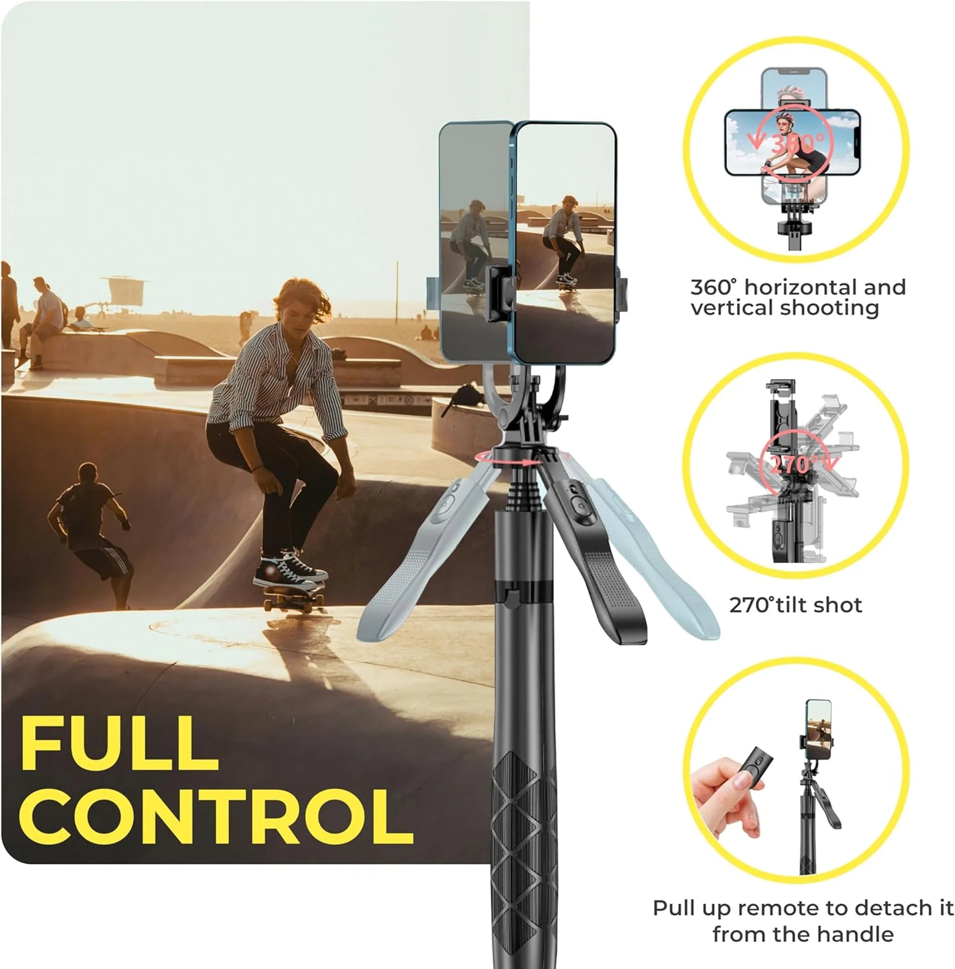 360? Rotation & Adjustable Height: best cell phone tripod with remote for panoramas. 360 rotation for content creator. The mini selfie stick goes from compact phone tripod to 62" phone recording stand