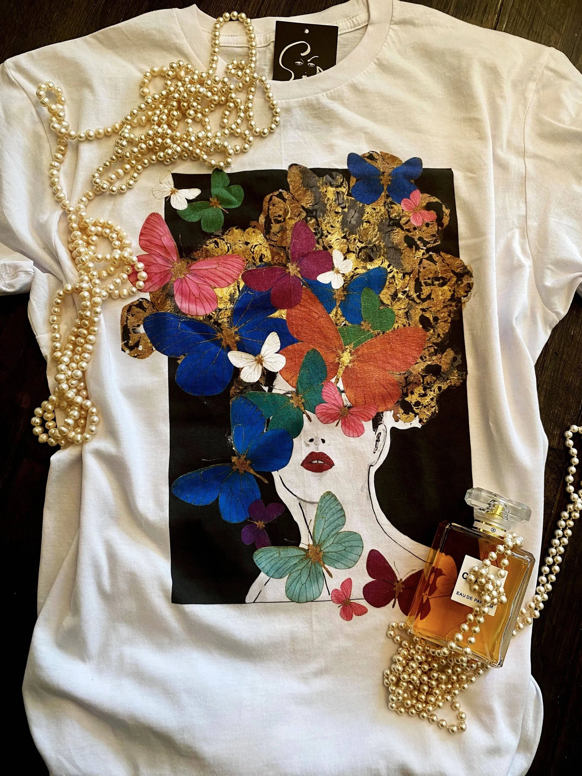 Butterflies on my mind! This Limited Edition tee is perfect for spring. This gorgeous fashion illustration makes a great unique tee. Colorful, beautiful and special - sure to turn heads!All tees are 100% cotton, breathable, and VERY comfortable!Tees come in unisex sizes. Sizes XS - 3XL available to order!