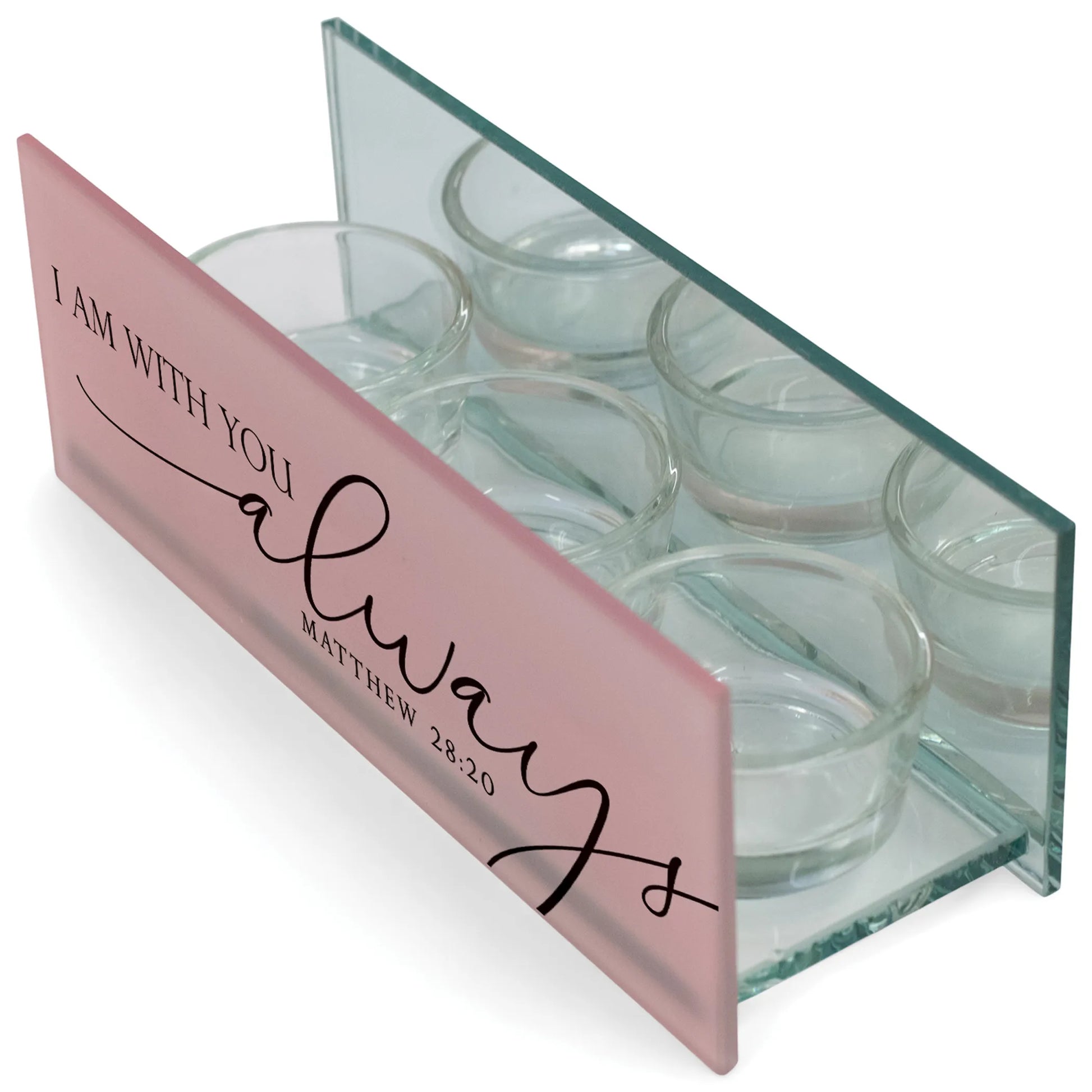 Petite Blush Tealight Holder Glows With Beauty And Inspiration. Glass Rectangles Are Frosted Outside, Mirrored Inside To Enhance The Soft Light Shining From The Three Included Led Tealights. Front Rectangle Is D?corated With A Warm And Meaningful Scripture. Size Is 7 Wide x 2.5 Deep x 2.5 High. Matthew 28:20: I Am With You Always.